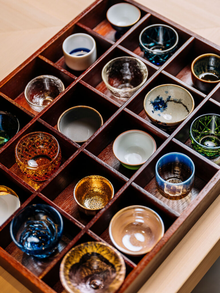 Dans un espace minimaliste, chaque objet devient une déclaration. Pour inclure les convives à la cérémonie du repas et, d’une certaine manière, au design lui-même, Ju Hyun Li propose une collection de coupes à saké rassemblées de part et d’autre du Japon, chacune ayant son propre caractère et sa propre histoire, y compris certain en verre taillé Edo Kriko. « Les convives sont invités à choisir la coupe qui leur parle, afin qu’ils puissent déguster le saké dans un récipient qui leur ressemble, que ce soit par sa texture, son poids ou son design », explique Ju Hyun Li. « C’est notre façon de rendre chaque petit moment profondément personnel. »