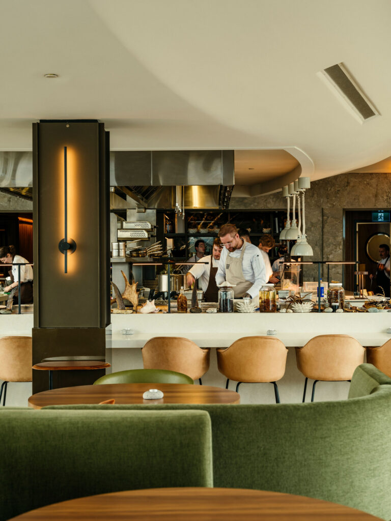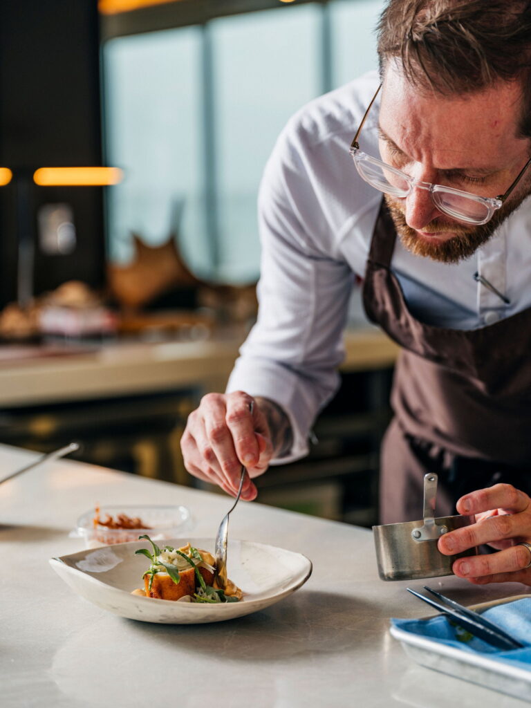 Par un soir d’été, après un tartare de pétoncles pêchés en plongée en Nouvelle-Écosse dans une aguachile vivifiante à l’argousier, le poisson loup à ocelles a fait son entrée. Une paupiette luisante, bordée d’un brun mordoré, reposait dans un paysage surréaliste de tuiles coralliennes, de pousses vertes enroulées, de pois de mer et de pointes d’asperges – un arrangement à mi-chemin entre le sauvage et le structuré, évoquant à la fois les mares intertidales et les parterres de jardin.